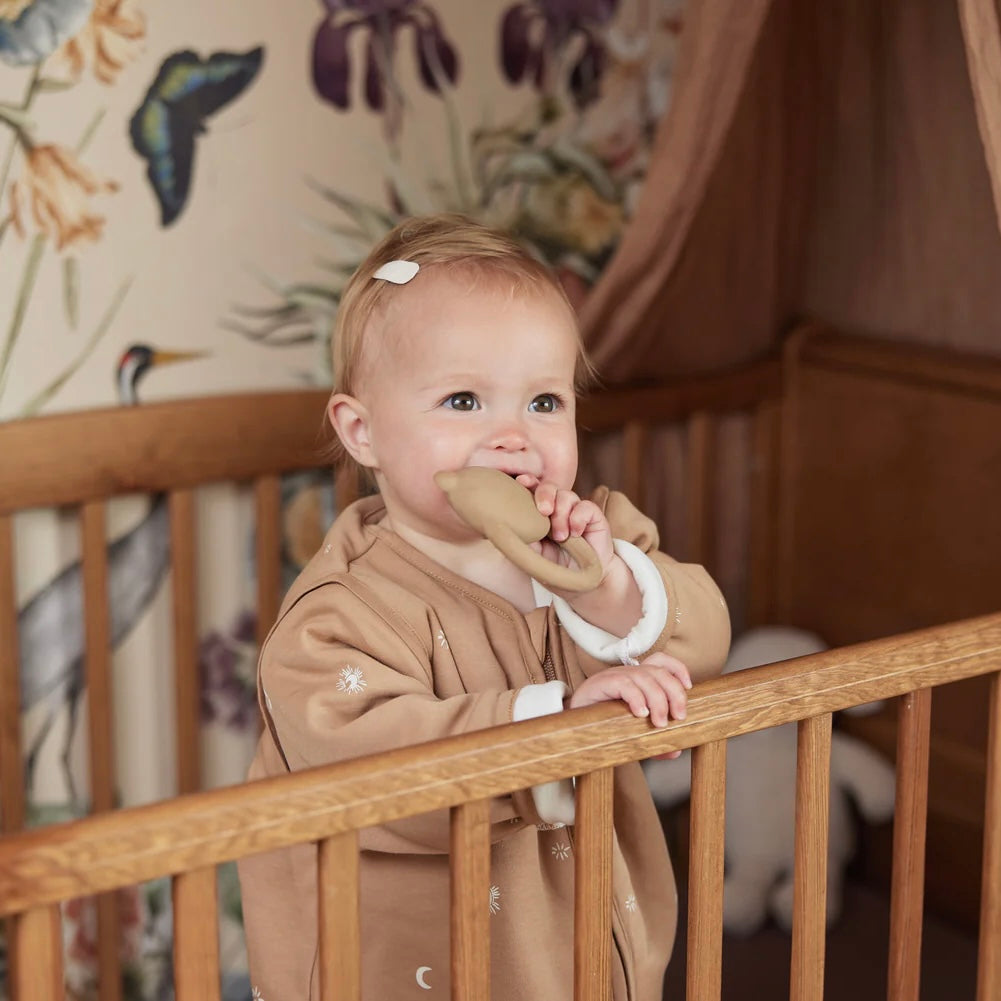 Deze bijtring van 100% natuurlijk rubber biedt verlichting bij doorkomende tandjes. Je baby kan er veilig op sabbelen en bijten, wat helpt de druk op het tandvlees te verminderen. Voor extra verkoeling kun je de bijtring kort in de koelkast leggen (niet in de vriezer). De milde kou verzacht het ongemak en kalmeert gevoelig tandvlees. Geschikt voor alle leeftijden en volledig veilig te gebruiken vanaf de geboorte.