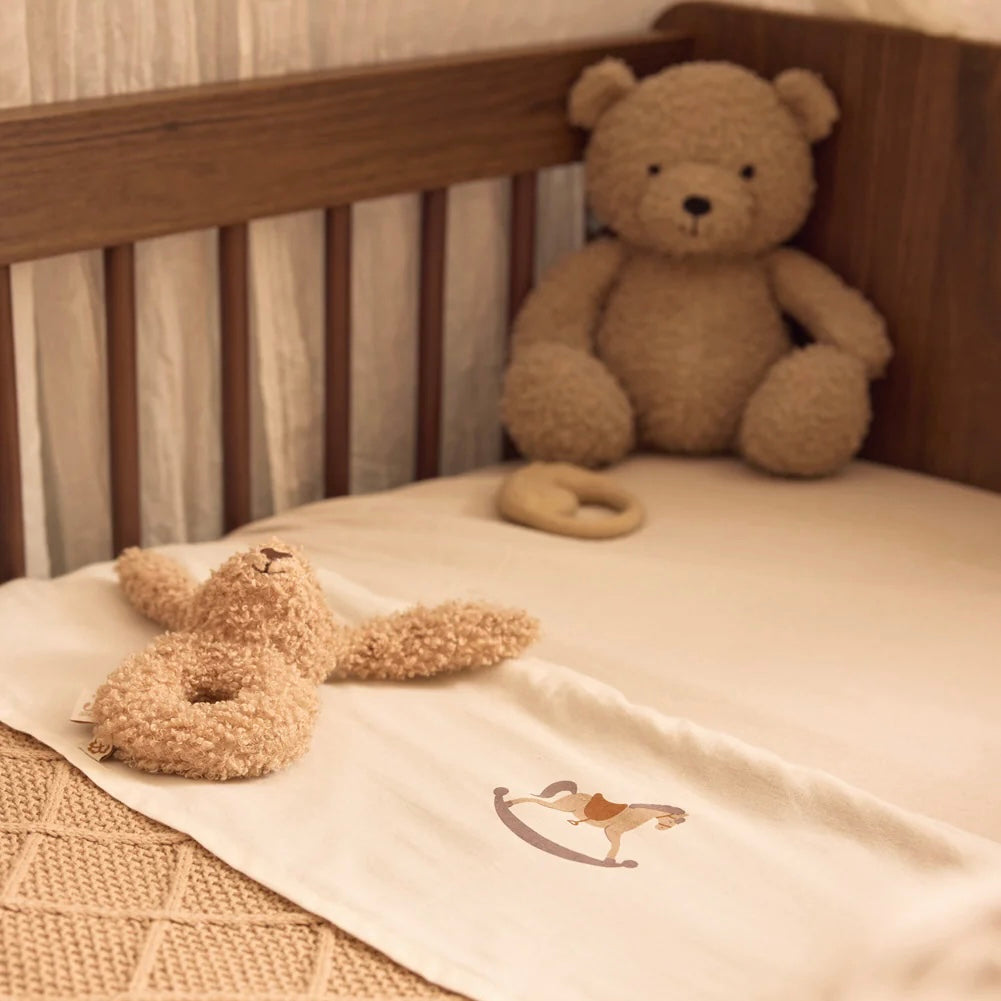 Met deze schattige konijnen rammelaar zal jouw kleintje zich uren vermaken. Dit heerlijk knuffelige item in zacht biscuitkleurig bouclé stofje heeft een lief geborduurd hartje als neusje. Deze rammelaar maakt een geluidje wanneer je hem schudt. Dit is toch het allerliefste konijntje?